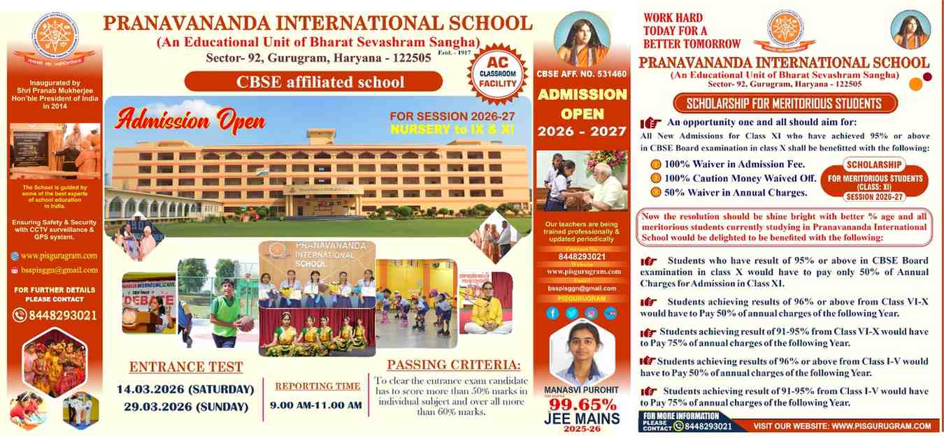 ADMISSION FOR THE SESSION 2025 - 2026 IS OPEN FOR THE CLASSES NURSERY TO CLASS - IX & CLASS - XI. Contact Nos. : 844 829 3021