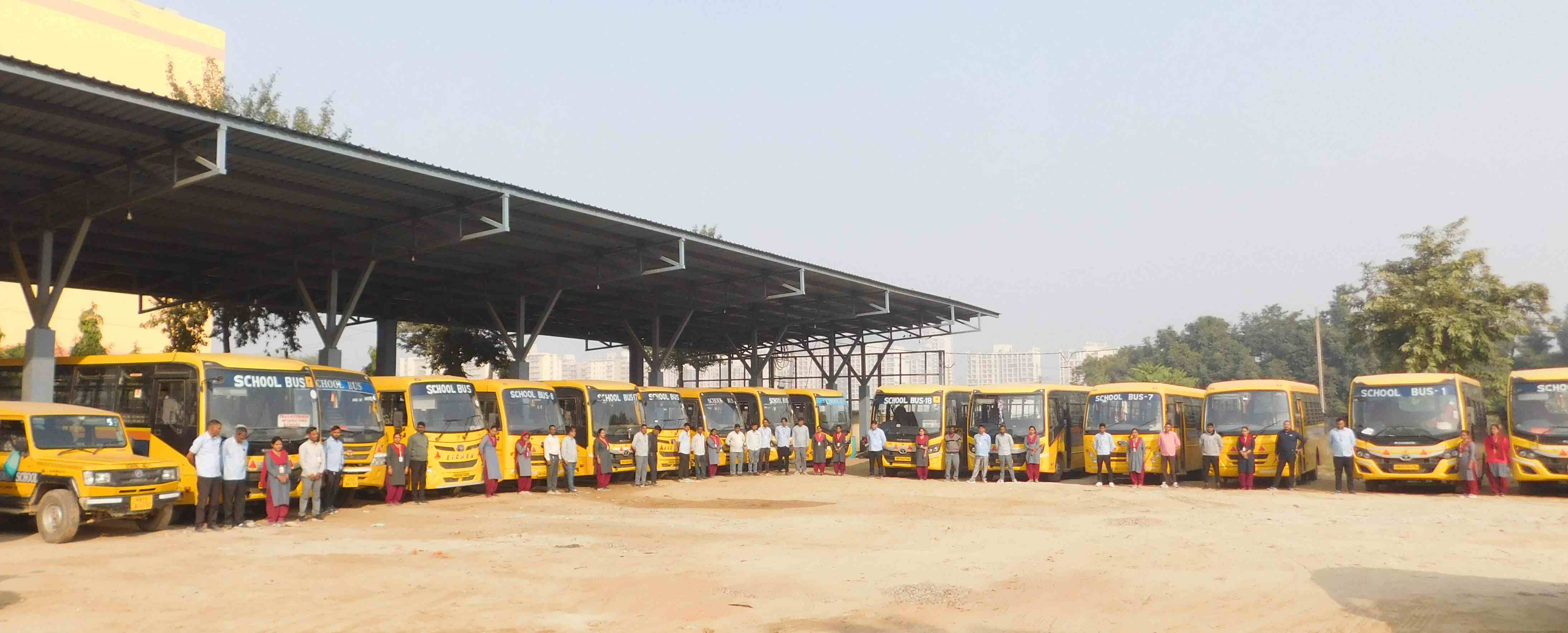 The school has its own fleet of buses fitted with GPS systems and CCTV cameras. The buses ply through different routes --- Sare Home, Raheja Navodaya, Tulip Petals, Orris Carnation, DLF 86-90, Bestech Ananda, Vatika, Aliyar, Farukhnagar, Manesar, Gurgaon Sec - 5, Sector - 10 etc.